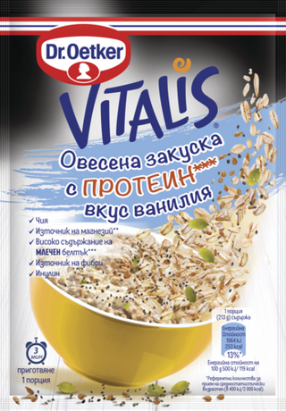 Бързате, нямате време за закуска, но сте убедени, че това е най-важното хранене за деня. Или гладът е подранил преди времето за обяд или вечеря. Ето го решението - овесена закуска Vitalis на Dr. Oetker. Залейте съдържанието на едно пакетче с гореща вода и след 3 мин. може да се насладите на една порция лека и балансирана закуска. Леката и балансирана закуска са тайната на доброто настроение и свежите моменти през деня. А Vitalis е перфектната комбинация - качествени продукти, пълнозърнести овесени ядки, сушени плодове и супер храната чия. Богата на фибри, витамини и минерали. Бързото и лесно й приготвяне улеснява ежедневието ви и ви зарежда с необходимата енергия за нови предизвикателства. Тайната на доброто настроение и доволната усмивка се крие в малките зрънца овес и неустоимите съставки. Изберете любимия си вкус и започнете деня с усмихнато лице!