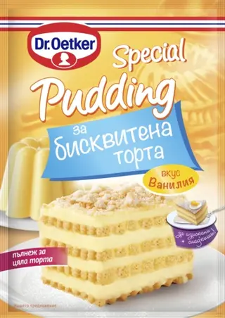 Пригответе Специалния пудинг според инструкциите на опаковката, като използвайте 800 мл прясно мляко и 80 г захар. Отстранете готовия пудинг от котлона, добавете към него белия шоколад, изчакайте 2-3 минути да се разтопи и разбъркайте. Охладете на ледена баня.