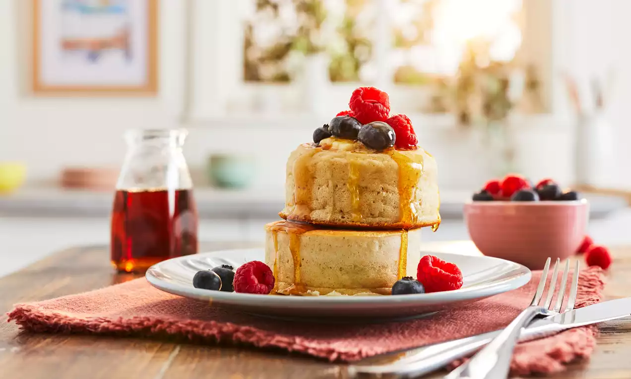 Поднесете горещите японски палачинки с кленов сироп и пресни горски плодове.