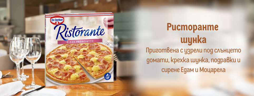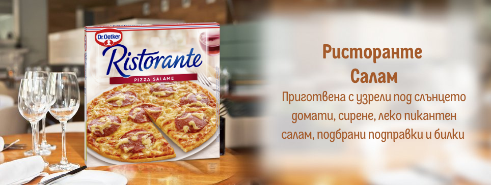 Пица Ristorante се предлага в най-популярните и любими разновидности – Прошуто (Шунка), Четири сирена, Салам, Моцарела и Специална.