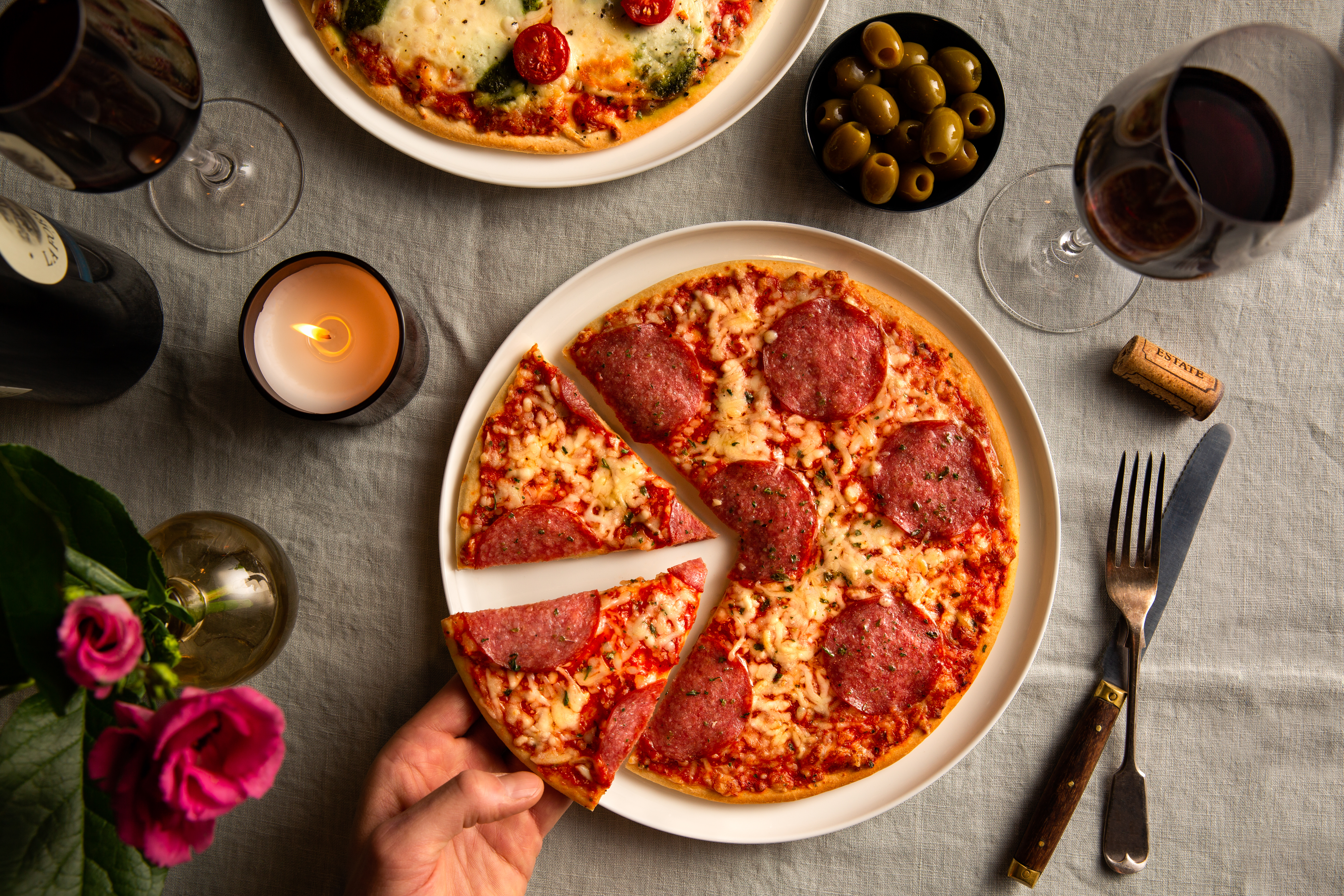 Не е необходимо да сте най-големият романтик, за да изненадате любим човек с мил романтичен жест. Нужни са ви само нежна музика, хубава бутилка вино и една (или пък две) пици Ristorante. Гарнирайте пицата с прясна рукола и пармезан, панчета (бекон), сос пекорино и се насладете на любимото "мммм". И тъй като малките неща правят любовта голям, за финал декорирайте масата с ваза с естествени цветя, запалете ароматни свещи и бързо, и лесно ще пренесете така желаната италианска романтика у дома.